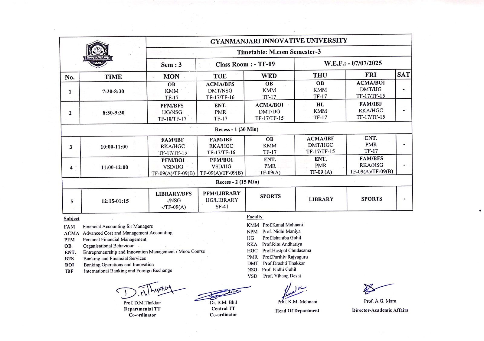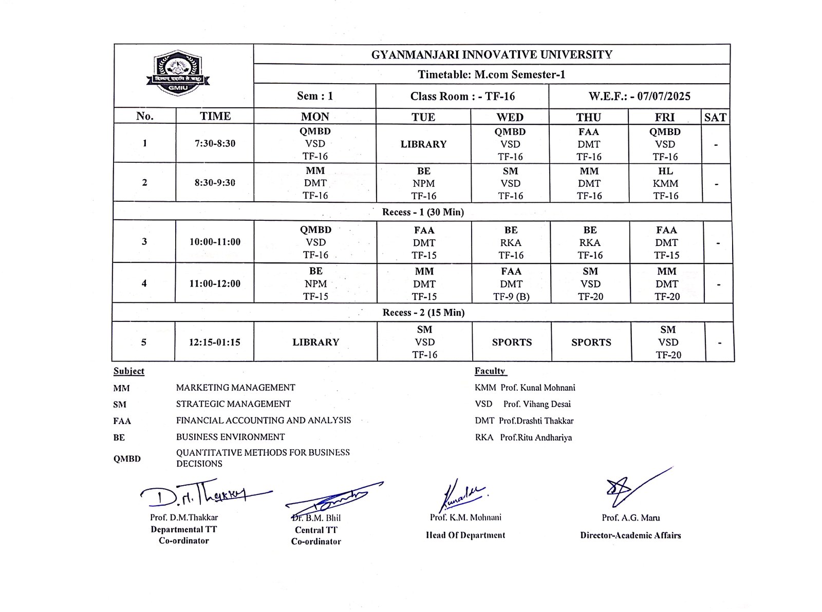 Subject Code | Subject Name | Short Name | L | T | P | Credit |