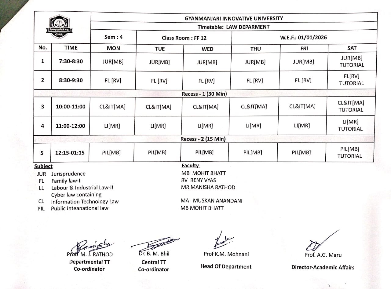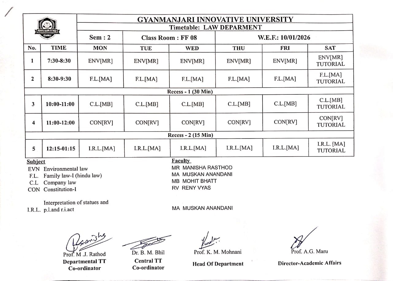 | LAWLL12510 | Interpretation of Statues and principles of Legislation &Right to Information Act | I.R.L | 5 | 1 | 0 | 6 |